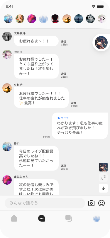 純粋にあなたのファンだけが集まる安心安全なグループチャットです。ファンはあなたへの「好き」を思う存分語れます。あなたもチャットに参加する事が出来ます。